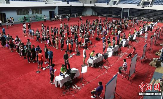 8月15日,北京清华大学2012级新生排队拍证件照。与往年不同,清华大学此次在报到区外设置“警戒线”,家长一律只能在线外等候,新生必须带着材料独自登记入学。当日,三千多名新同学到清华大学入学报到,其中包括港澳台地区通过参与“优秀高中生清华体验营”而申请入校的港澳台地区学生。中新社发 李慧思 摄