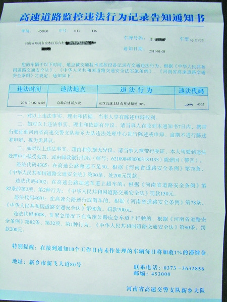 在背页上,有汇款方式以及相关法律、法规的节录。在罚单上,还有“河南高速交警支队新乡大队”的落款、地址和电话。违法通知书显示,侯先生的车2011年1月2日在京珠高速新乡段555公里处超速20%,按照《河南省道路安全条例》第90条规定,需处200元罚款。