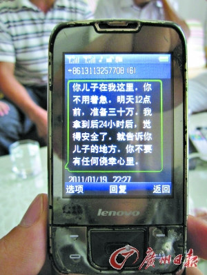 短信至今仍保留在他的手机里。记者看到,短信上说,“你儿子在我这里,你不用着急。明天12点前,准备三十万元,我拿到后24小时后,觉得安全,就告诉你儿子的地方,你不要有任何侥幸心理”。