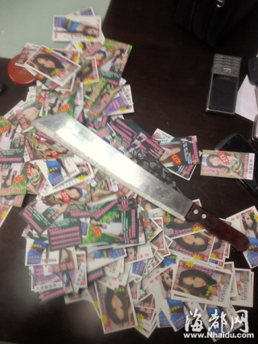 这伙年轻人在福州多家商务宾馆发放色情服务小卡片,“清纯学生妹,上门推拿、温馨服务……”卡片上不仅有诱惑的文字,还配上美女照片,撩拨着寂寞的房客。只要拨打卡片上的“相约电话”,就会有学生妹上门。而跟在学生妹后面的,还有雪亮的砍刀和匕首。