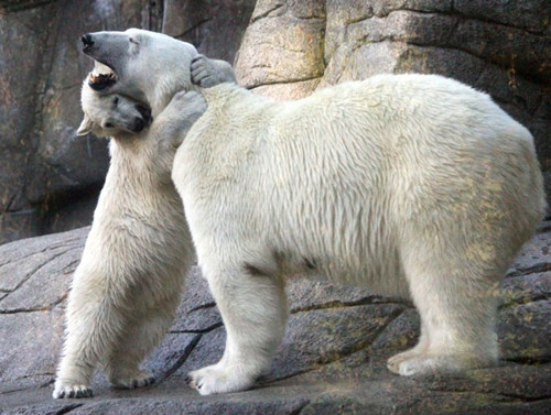 在孩子拥抱自己后,北极熊妈妈似乎也没了脾气,不再“追究”孩子的淘气之举。不过,动物园工作人员称,拥抱已经成了这只熊宝宝讨妈妈欢心的老招数了。