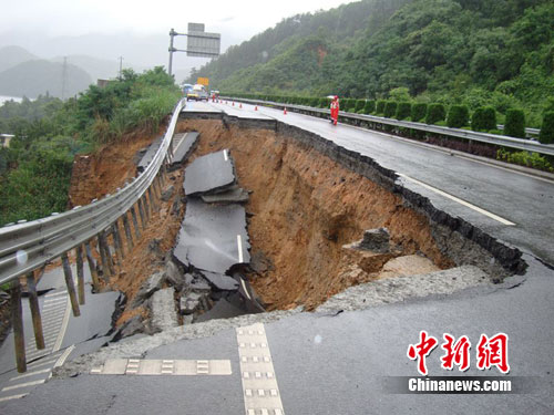 不久,支援队友赶到,近200辆车被拦下。由于下雨天,不知道情况的司机和乘客纷纷开始抱怨。10多分钟后,突然一声很闷的巨响。原本两三厘米的裂缝突然张开了大口子,而且越来越大,碎石不断地坠入深渊,路面从路肩开始慢慢往下塌陷。