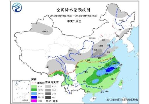 3月1日08时至3月2日08时,新疆西部及沿天山地区、青藏高原东部、西北地区东部、内蒙古东北部、东北东南部及西北部、华北中南部、黄淮北部等地有小到中雪或雨夹雪;西藏东南部、陕西南部、西南地区东部、云南西北部、黄淮南部及其以南地区有小到中雨或阵雨,其中,江南北部及中部等地有大到暴雨;内蒙古东部、华北北部、东北南部等地有4~5级风。