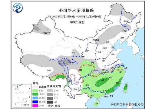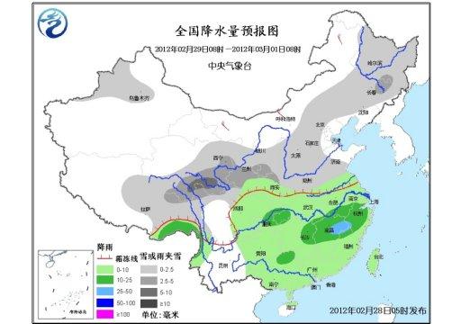 29日08时至3月1日08时,新疆西部及沿天山地区、青藏高原东部、西北地区东部、内蒙古中东部、东北、华北、黄淮北部等地有小到中雪或雨夹雪,其中,青海东南部局地有大雪;西藏东南部、陕西南部、西南地区东部、黄淮南部、江汉、江淮及其以南地区有小到中雨或阵雨,其中,江西东部等地局部有大雨;内蒙古等地有4~5级风。