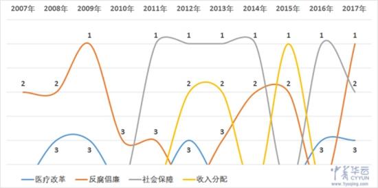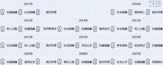 根据中青华云大数据综合参考人民网、央视新闻、中国经营报组织的网民投票结果统计显示,在近10年来的两会热点TOP3的数据中,反腐倡廉上榜9次,且在2009年和2017年都位列榜首。社会保障从2011年开始,连续4年位列两会热点榜首。