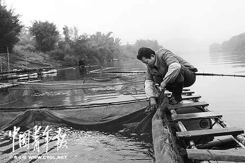 2月2日下午,广西宜州市怀远镇加乜屯渔民唐桂荣望着网箱内不断死去的鱼苗,内心充满惋惜。本报记者 谢洋摄
