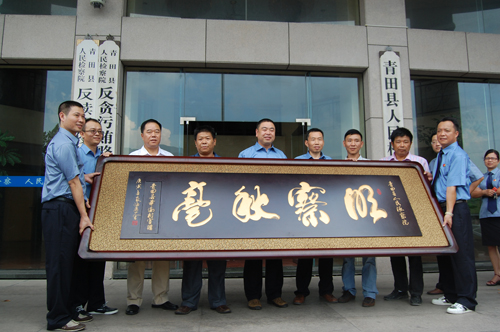 中新网8月6日电 据青田县侨联消息,8月3日,浙江青田华侨“村官”包万利、洪树林、周亮洪、吴华飞等带着上书“明察秋毫”的牌匾送到县人民检察院,感谢检察院为村民们办的件件实事。