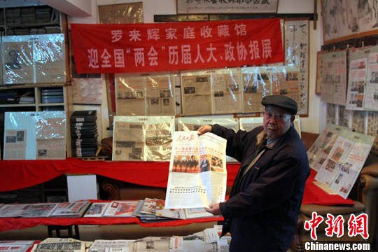 “这些报纸都是两会历史的见证,是我们国家政策的见证……”,罗来辉告诉中新社记者,他从1972年就开始收藏各种报刊、期刊、书籍供自己工作、学习之用。39年来,他已收集了各类报纸10万余份,书籍期刊1万7千余册,以及邮票、钱币、徽章等各类收藏,并多次举办展览供人欣赏。