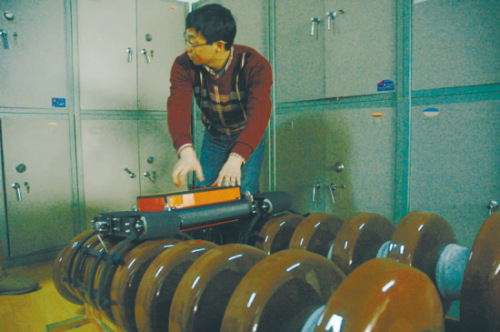 在中科院沈阳自动化所,记者还看到一款“绝缘子检测机器人”,目前已成功推向市场,并被国家电网东北地区各个超高压分公司采购。这款机器人能够在500千伏超高压输电线路的耐张塔双联水平瓷绝缘子串上自主行走,其上携带智能绝缘子检测仪等设备,能够带电自主检测零值或低值绝缘子。(记者 封葑/文 王雁/摄)