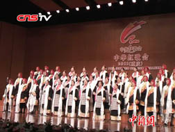 红旗飘飘,歌声飞扬。6月29日上午,来自全国各地的108个合唱团参加了在重庆奥体中心举行的 2011(重庆)中华红歌会开幕式。近4万红歌演员轮番上阵,演绎了一曲曲经典红歌,庆祝中国共产党成立九十周年。
