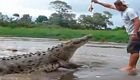 实拍男子嘴叼小鱼近距离挑逗鳄鱼