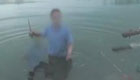 男子发现鸭子被冻湖面 跳湖破冰救援