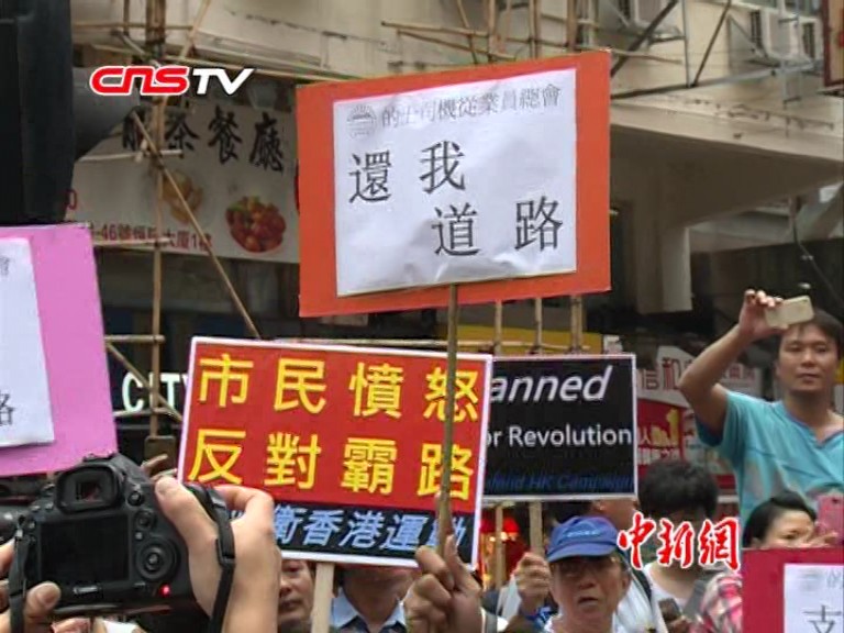 【解说】10月22日,香港非法“占领中环”行动已经持续了25天,香港的的士司机“忍无可忍”,他们手持香港高等法院颁布的临时禁制令到旺角部分被霸占的道路清理路障,期望恢复交通,但行动遭到占中人士的强力阻扰,双方一度发生推撞。