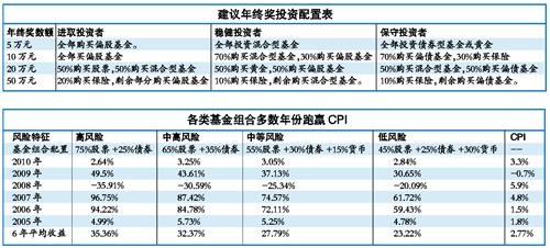 每个人的年龄阶段不同,风险承受能力不同,资产状况不同,选择投资产品的比例也会有所不同。对于5万元、10万元、20万元、50万元的年终奖数额,理财专家给出了以下组合安排: