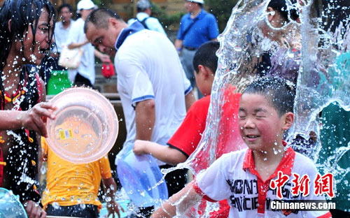 远离云南的苏州,也有了“泼水节”。7月1日,为期二个月的“白象湾泼水节”开幕。众多游客与十几位傣族、佤族、哈尼族的姑娘和小伙一起展开“泼水大战”,感受到不一样的民族风情和夏日戏水的快乐。中新社发 李克祥 摄