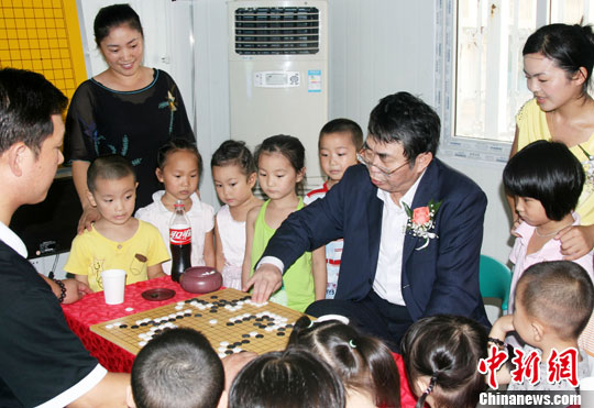 9月21日,“棋圣” 聂卫平在浙江省天台县丰泽幼儿园内的天台隐士围棋俱乐部零距离指导围棋爱好者的棋艺。图为聂卫平与围棋爱好者下指导棋。中新社发 丁必裕 摄