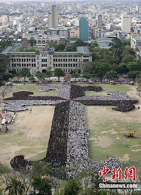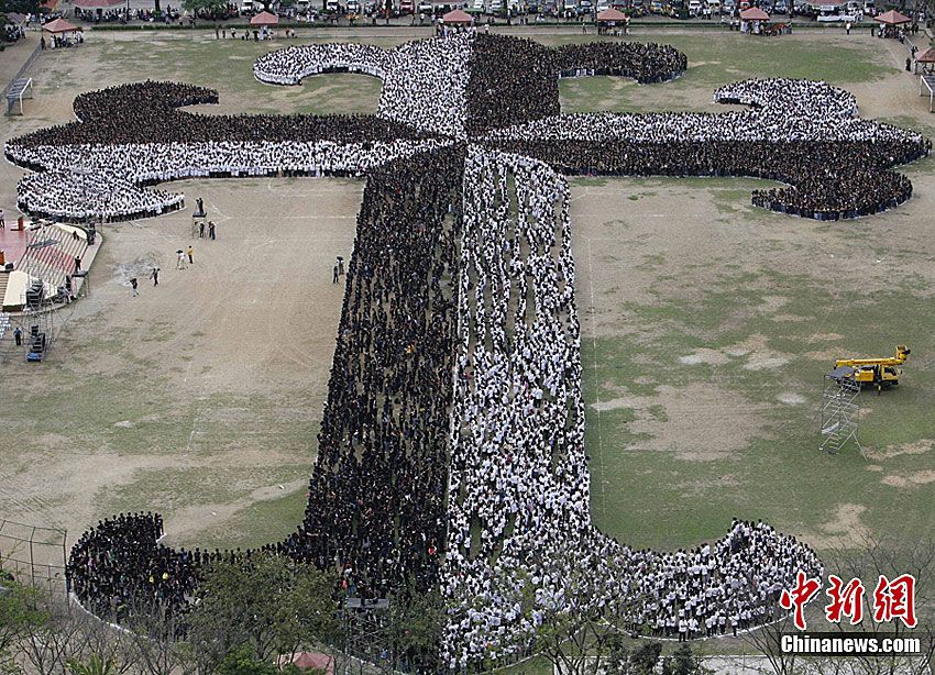 3月9日在一个庆祝斋戒开始的仪式上,菲律宾两万多人在马尼拉圣托马斯大学校园内排成一个巨大的黑白十字架造型。参加者有学生、学校管理人员和教职员工,他们组成的这个“最大人体十字架”将打破吉尼斯世界纪录。