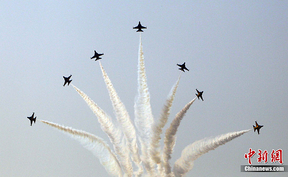 4月1日,韩国江原道,韩国“黑鹰”特技飞行表演队驾驶T-50B飞机进行飞行表演。图片来源:CFP视觉中国