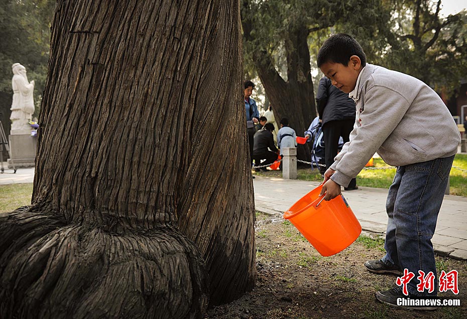 4月5日上午,北京孔庙和国子监博物馆举行清明祭拜先师仪式,清明祭拜先师活动包括宣读诰文、酹酒、洒扫、献花、行礼及浇灌等环节,以表达对孔子的缅怀和敬仰。中新社发 刘震 摄