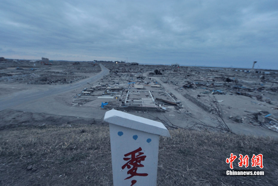 4月18日,距日本“3.11”大地震已有一个多月,佛教人士在极重灾区宫城县名取市废墟上面向大海默默诵经祈祷。中新社发 贾国荣 摄