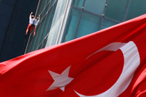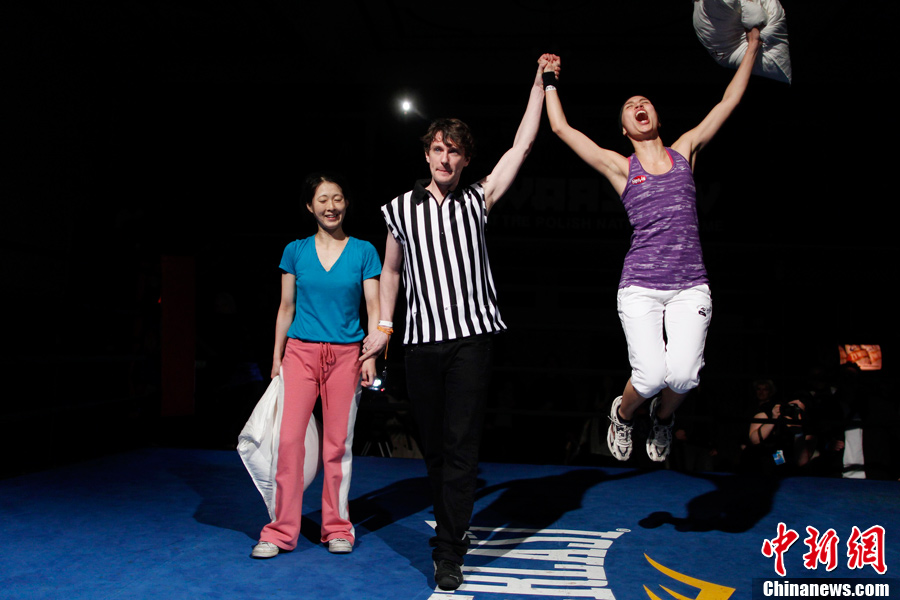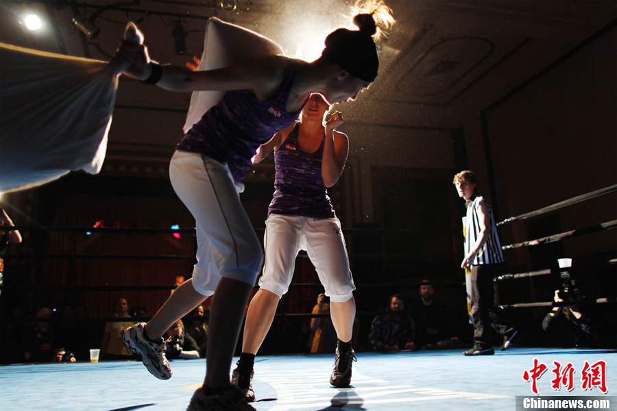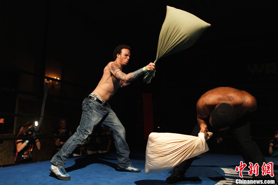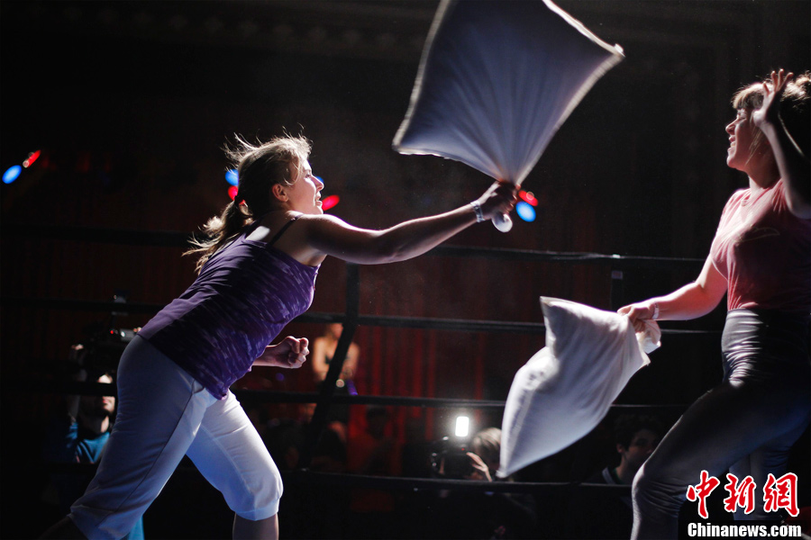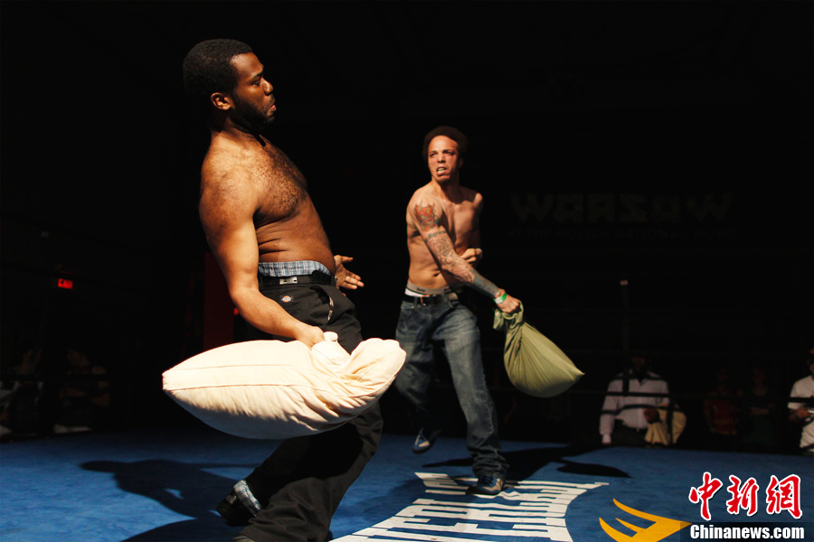 5月17日,首届世界枕头大战锦标赛在美国纽约激烈上演。图为来自奥地利和美国的选手在半决赛中进行争斗。