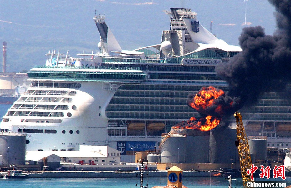 2011年5月31日,直布罗陀港的一个油罐突然起火,现场浓烟滚滚,在附近停泊的“海洋独立”号邮轮也被转移到了安全地带。