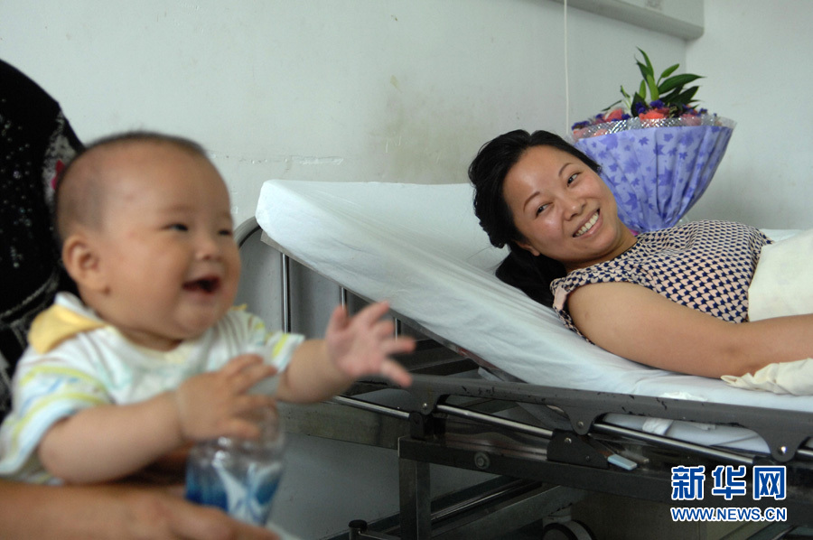 7月3日,当家人逗乐7个月大的儿子陈至轩时,躺在病床上的吴菊萍也露出笑容。 7月2日下午1点半左右,浙江杭州滨江区的一处住宅小区内,一名2岁女童从10楼突然坠落,在楼下的吴菊萍奋不顾身地冲过去用双手接住孩子。目前,被接住的女童正在浙江省儿童医院抢救,而徒手接住小女孩的吴菊萍,左手臂尺桡骨多段粉碎性骨折,正在富阳市中医骨伤医院进行消肿处理,等待手术治疗。今年31岁的吴菊萍,已有一个7个月大的儿子,一家人与坠楼女童一家同住一个小区内,事发之前素未谋面。黄宗治 摄 图片来源:新华网