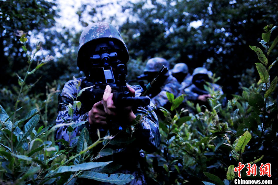2011年7月初,解放军在济南军区确山合同战术训练基地举行信息化大练兵,1万多人参与。代号为“前卫-211”的这次信息化集训,分为机动集结、观摩演示、对抗演练、比武考核、集训总结5个阶段。图为特种侦察分队利用微光夜视仪搜索前进。中新社发 杨洪武 摄