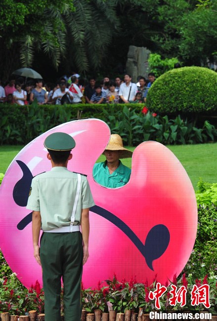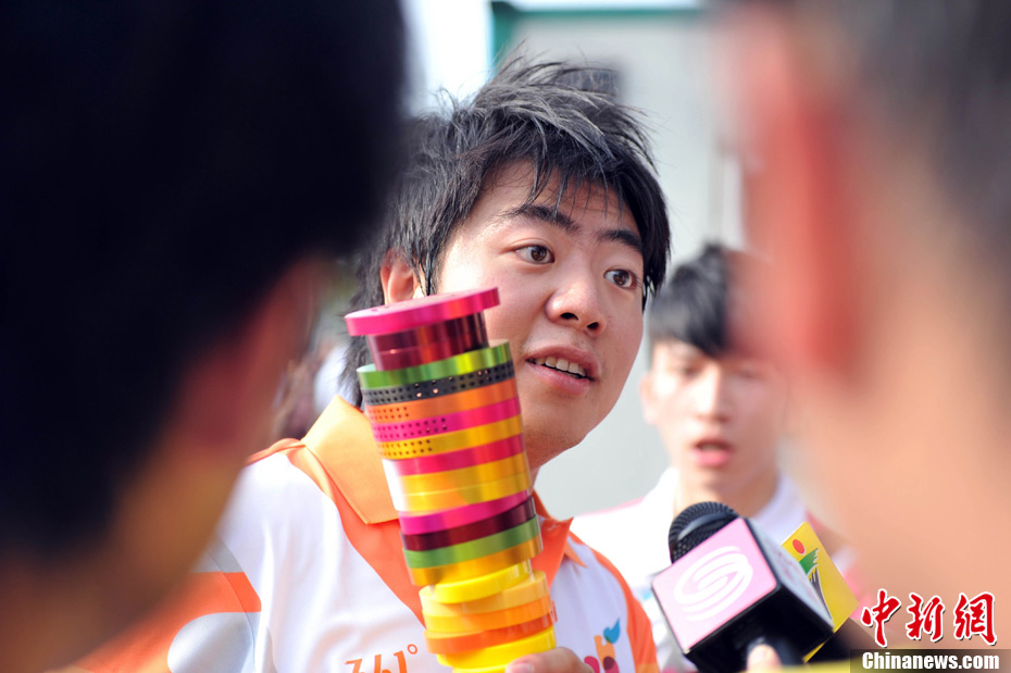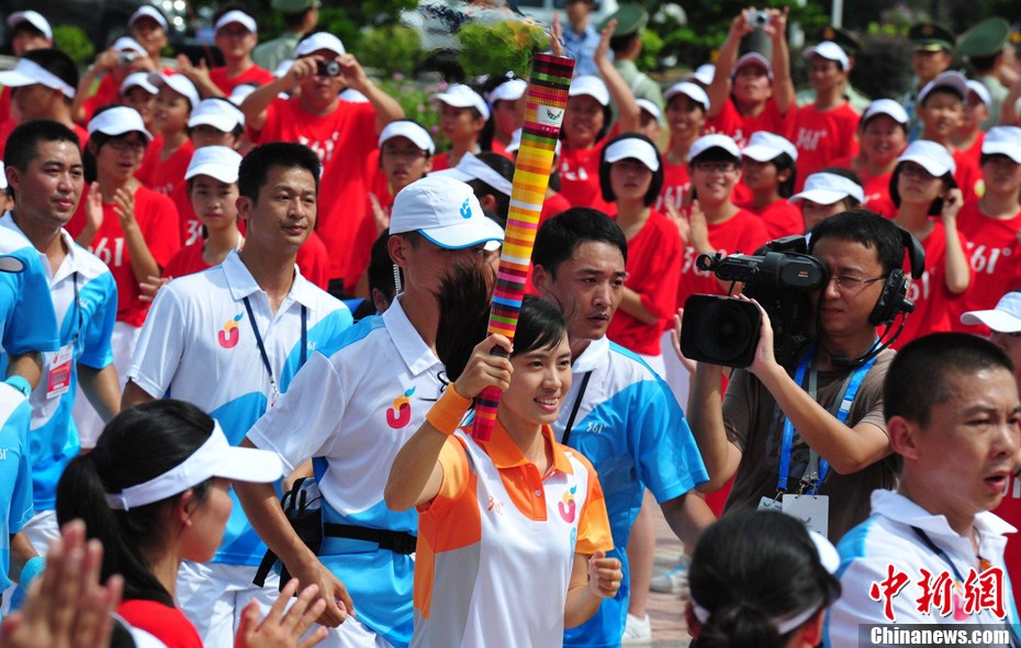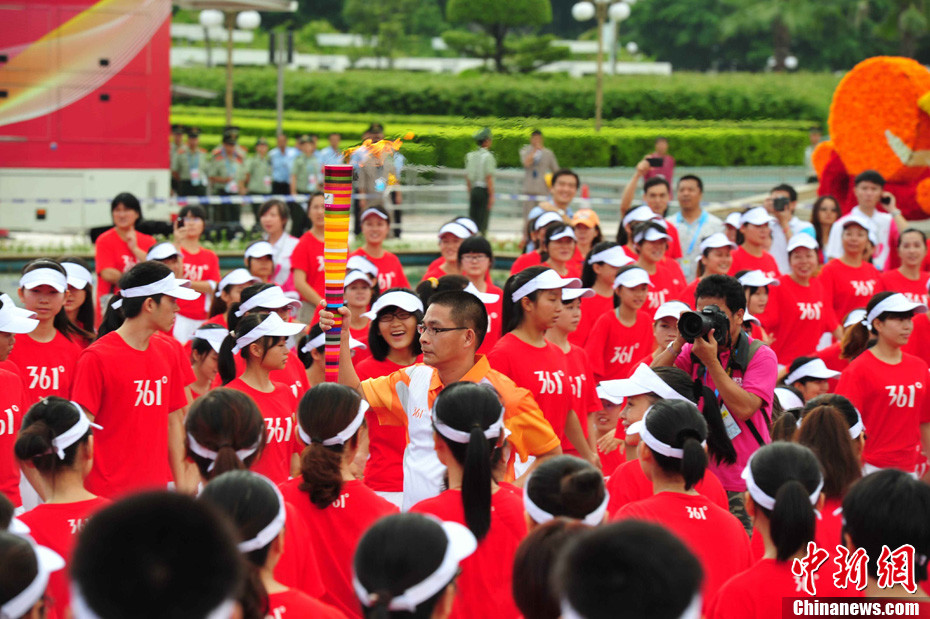 8月11日上午,大运会深圳城市火炬传递进入最后一站,起跑仪式在深圳龙岗举行,深圳市民陈润如作为首棒火炬手起跑。中新社发 柯小军 摄