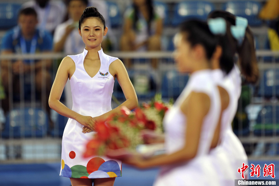 8月13日,深圳大运会竞技体操女子团体决赛在宝安体育中心进行,日本、乌克兰和俄罗斯分别获得冠亚季军。图为日本女子体操队站在冠军台上向观众致意。中新社发 陈文 摄