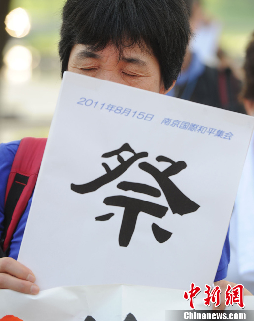 8月15日是日本宣布战败投降、中国人民抗日战争暨世界反法西斯战争胜利66周年的日子,来自海内外的各界人士在侵华日军南京大屠杀遇难同胞纪念馆和平广场举行南京国际和平集会,沉痛悼念南京大屠杀30多万遇难者,祈祷世界和平。图为来自日本的友好人士正在悼念南京大屠杀30万遇难者。泱波 摄