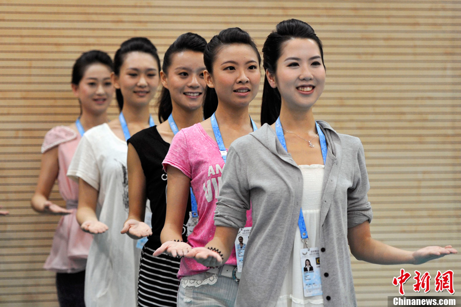 第26届深圳世界大学生运动会即将闭幕,台上光彩照人的颁奖礼仪志愿者们以青春靓丽的风采一次次成为赛场瞩目的焦点,她们用数不清的汗水与微笑服务着大运,成为了自信、青春和美丽的代名词。据了解,本届大运会共有350个礼仪志愿者参加大运会32个决赛场馆共306场颁奖仪式。中新网记者 金硕 摄