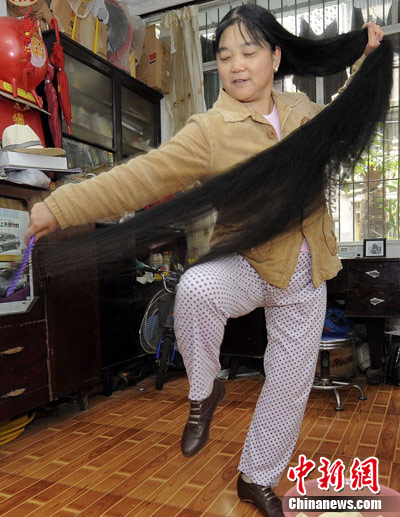 12月6日,在山西太原老军营街办小区一社区,“大辫子”倪林梅女士成为家喻户晓的“明星”。她今年55岁,十四年前从一头短发留起,至今头发已长成2.53米。据倪林梅讲,如今她的头发每年能长5寸,希望再过几年留得足够长,去申请“吉尼斯之最”。同时,她还希望有机会能参加一个专门“秀长发”比赛,与其他长发女性一起交流养发心得。韦亮 摄