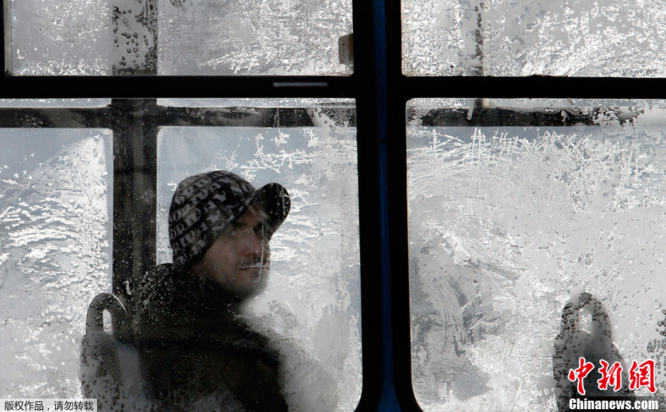 图为2月1日,罗马尼亚康斯坦察,一只海鸥飞过已经冰封的大海。