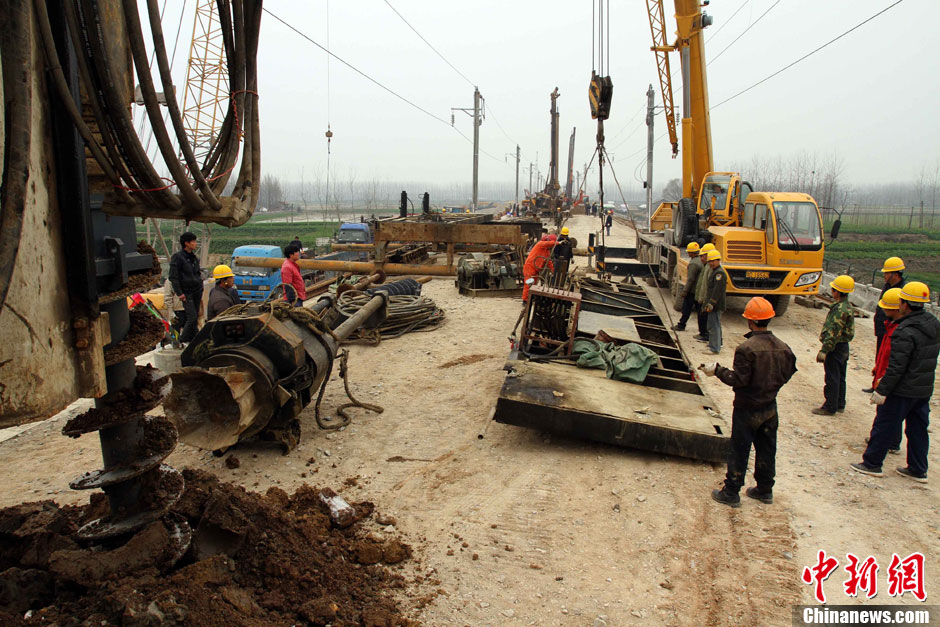 3月12日,施工机械在汉宜铁路潜江段对路基进行加固。中新社发 张畅 摄