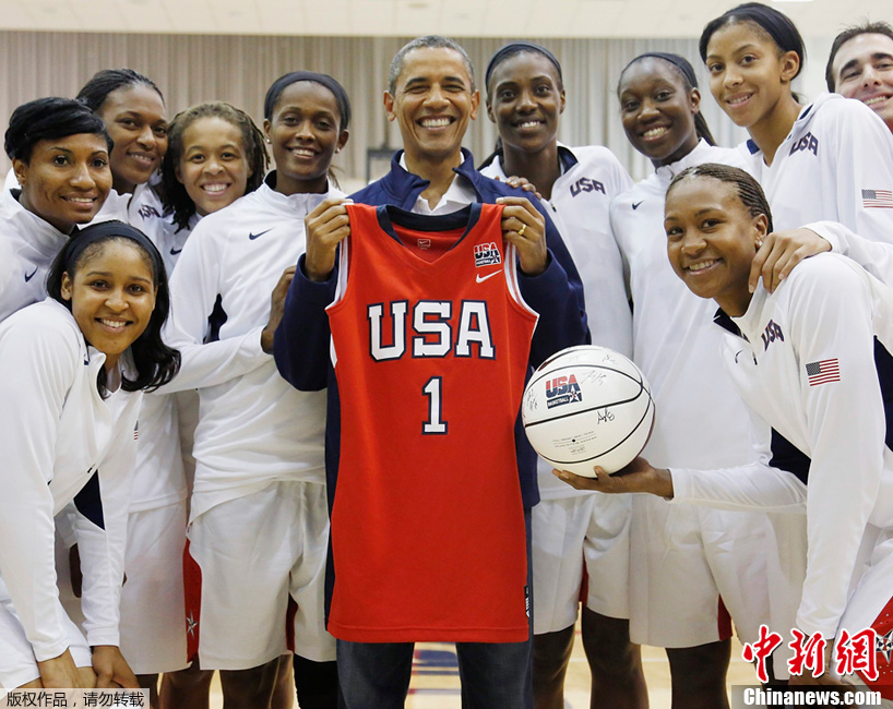 当地时间2012年7月16日,美国华盛顿,美国总统奥巴马观看了美国女篮和巴西队的表演赛,赛后奥巴马和美国女篮队员合影,并获赠1号球衣。