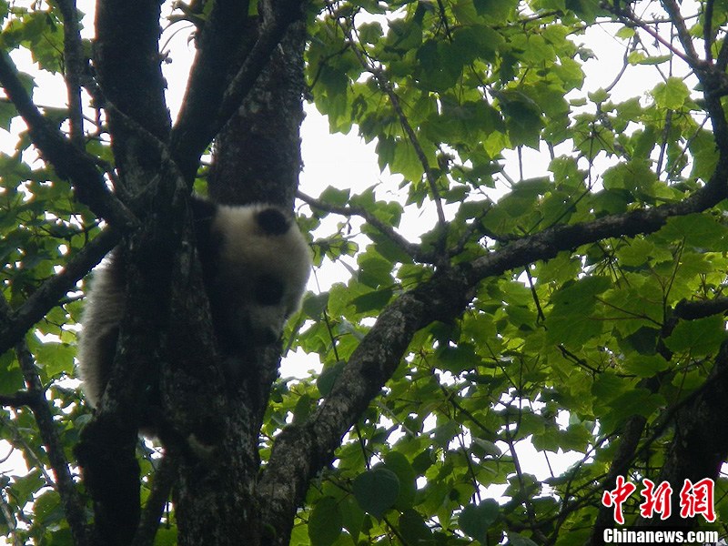四川省林业厅第四次大熊猫调查队7月12日在卧龙自然保护区盘龙寺东部附近海拔3000米左右的针阔混交林的一棵树上,发现了一只约一周岁的大熊猫幼仔。因为通讯信号的原因,这只大熊猫幼仔的照片于16日晚才由在野外奋战16天的黄莲沟分队队员送回大本营。图为调查队员拍到的野生大熊猫幼仔。陈树林 摄
