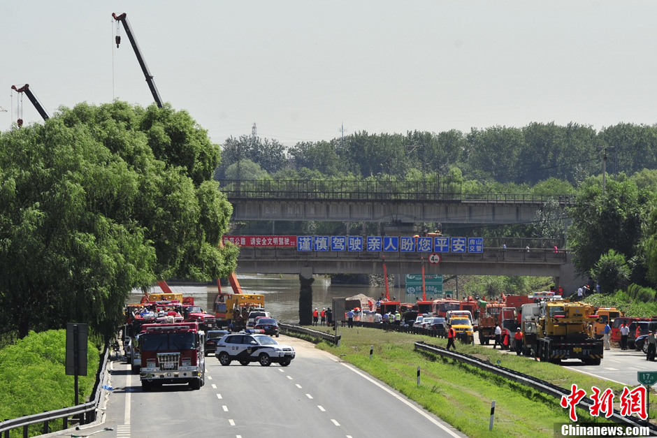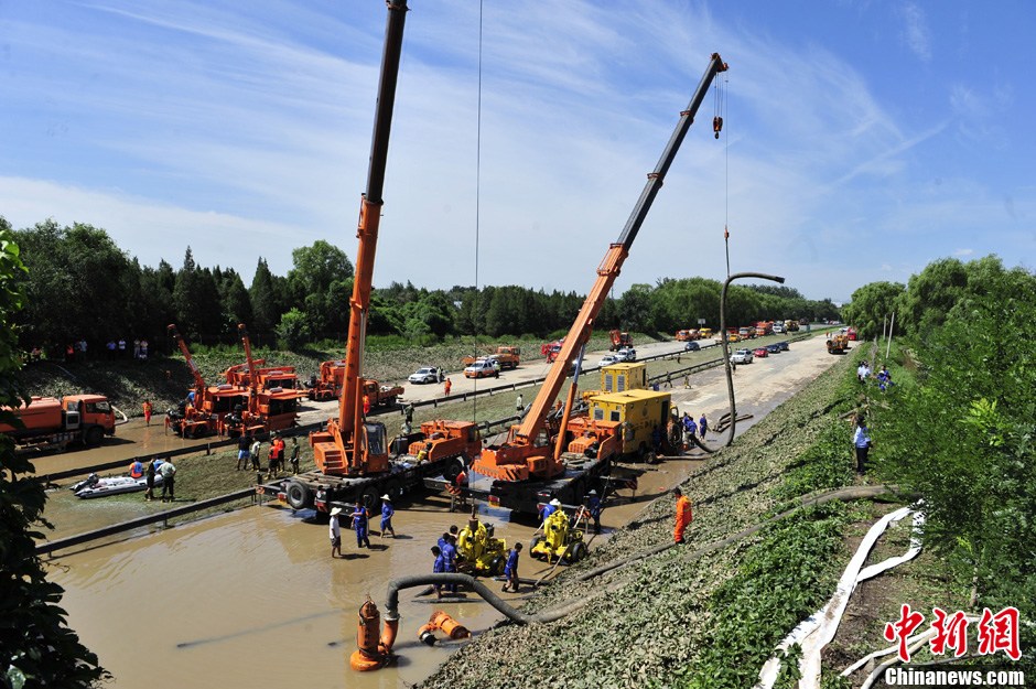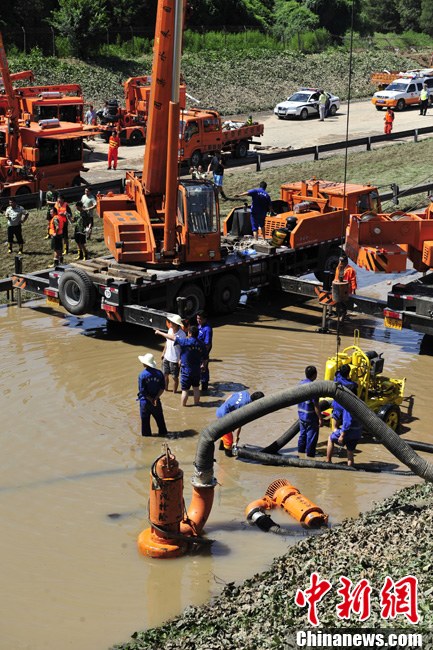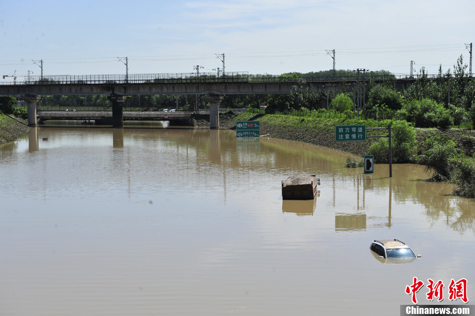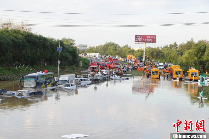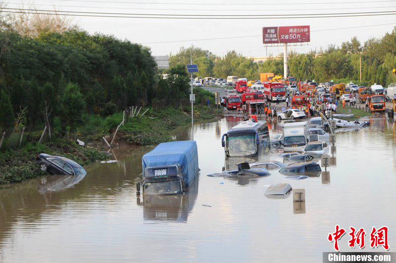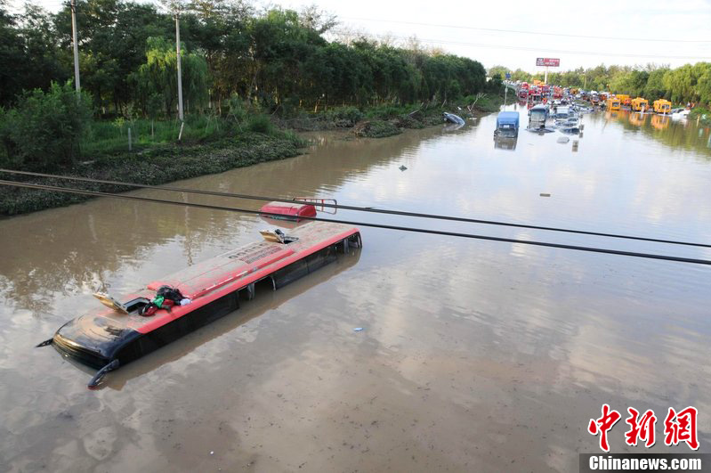 2012年7月22日,北京,在京港澳高速(原京石高速公路)南岗洼路段,汽车被淹在积水中。当日,受21日夜间暴雨影响,京港澳高速(原京石高速公路)南岗洼路段严重积水,数十辆各种车辆路过这里被淹,北京排水集团抢险大队的多台防汛应急车紧急排水救险。郑永 摄 图片来源:东方IC