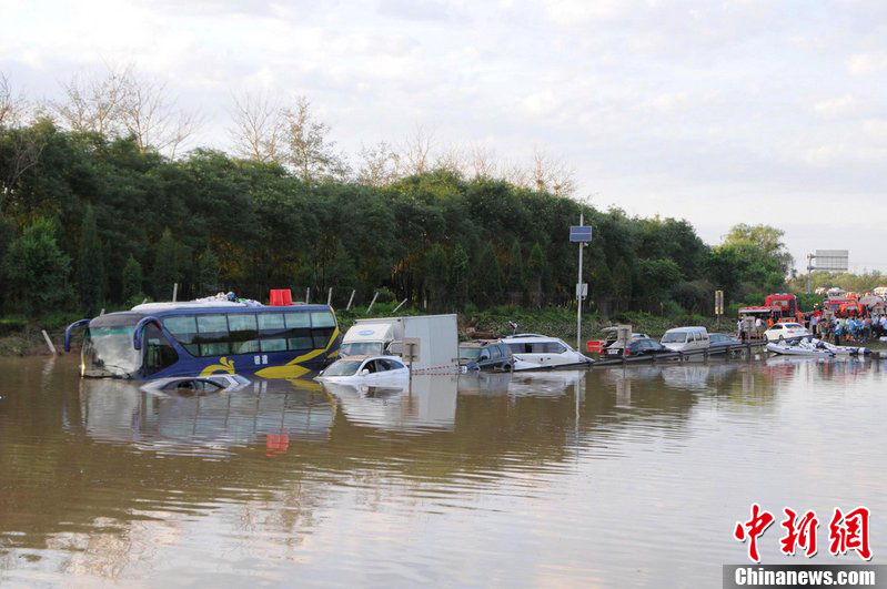 京港澳高速部分路段积水淹没指示牌 汽车泡在水中