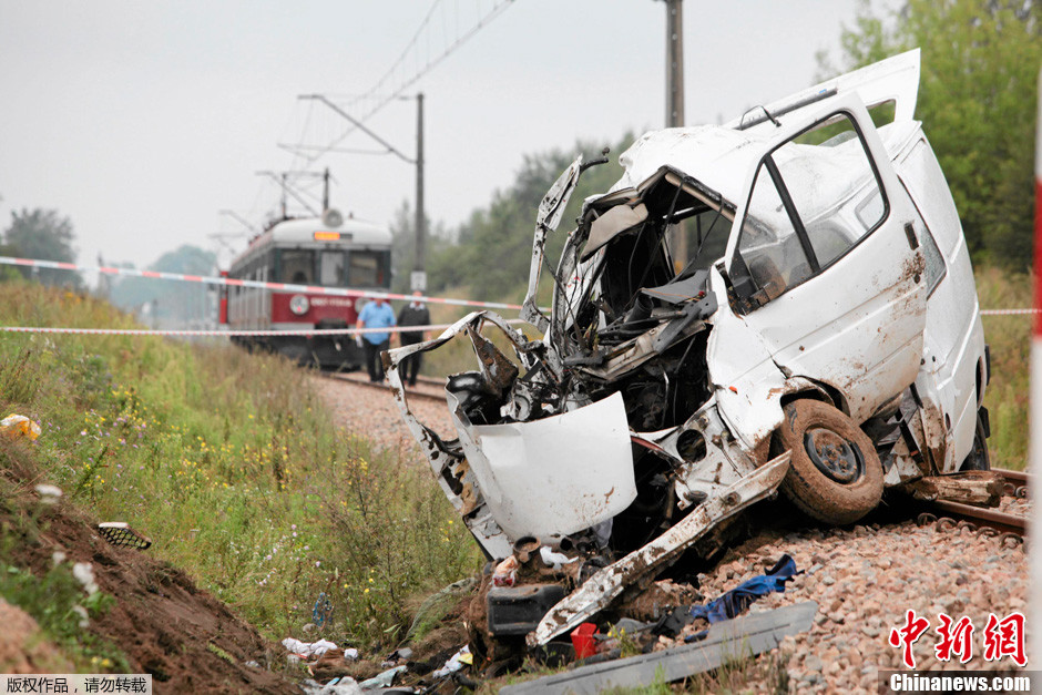 当地时间2012年7月30日,波兰中部罗兹市,一辆载有10人的汽车在一平交路口与一辆火车相撞,造成8人死亡,2人受伤。图为救援人员正在现场施救。