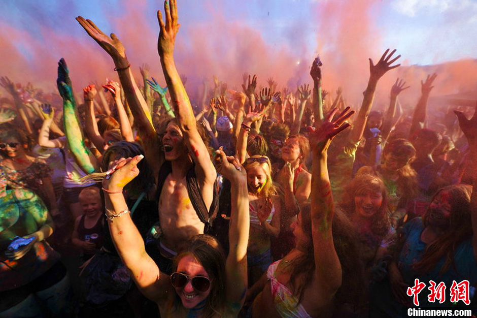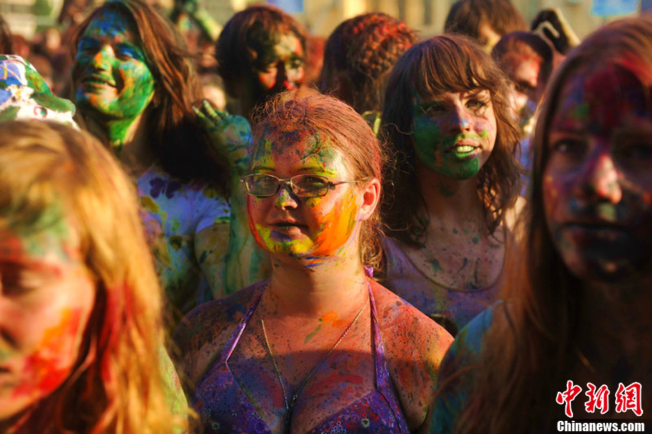 当地时间2012年7月29日,俄罗斯圣彼得堡,人们庆祝印度胡里节。胡里节也被称为洒红节,洒红节起初是印度教徒庆祝的春节,在这一天,人们相互泼有颜色的水和洒彩色粉末。图片来源:东方IC 版权作品 请勿转载