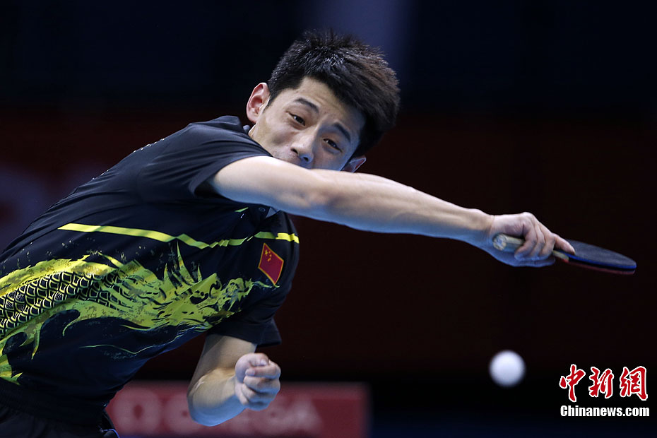当地时间8月2日,2012年伦敦奥运会乒乓球男单决赛,中国选手张继科以4:1战胜队友王皓夺冠。图为张继科在比赛中。图片来源:Osport全体育图片社