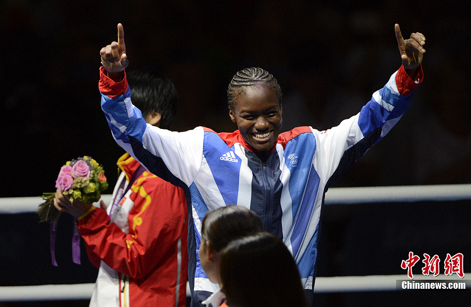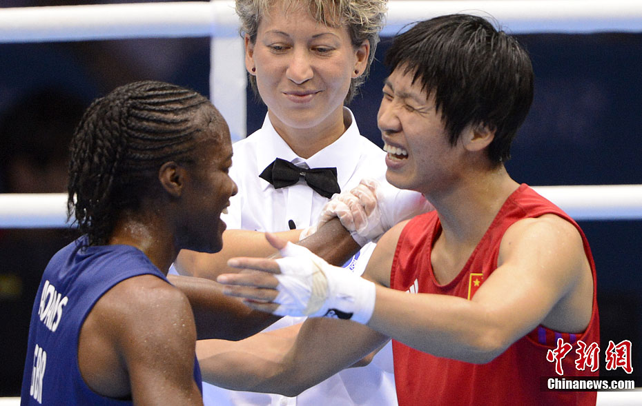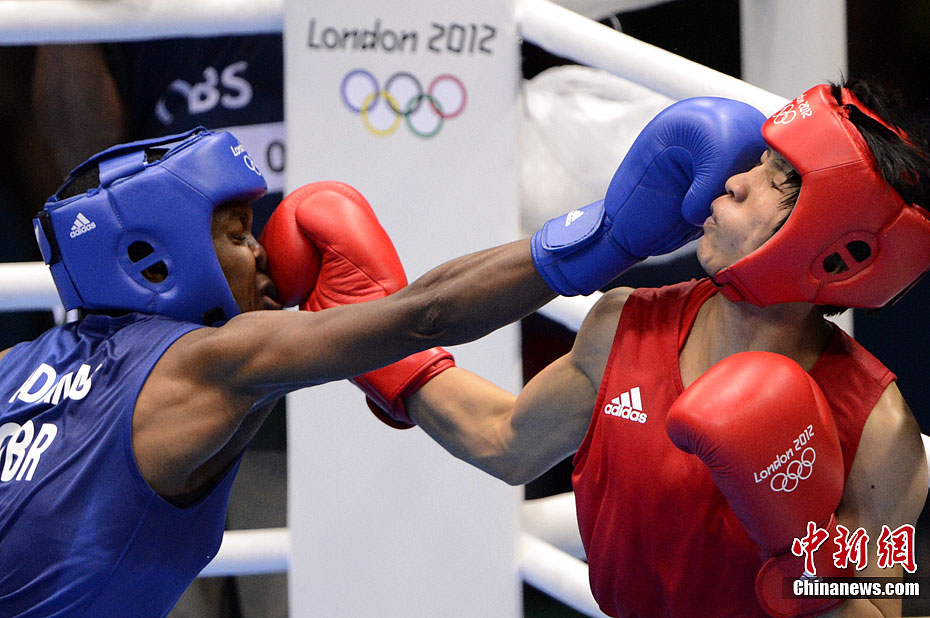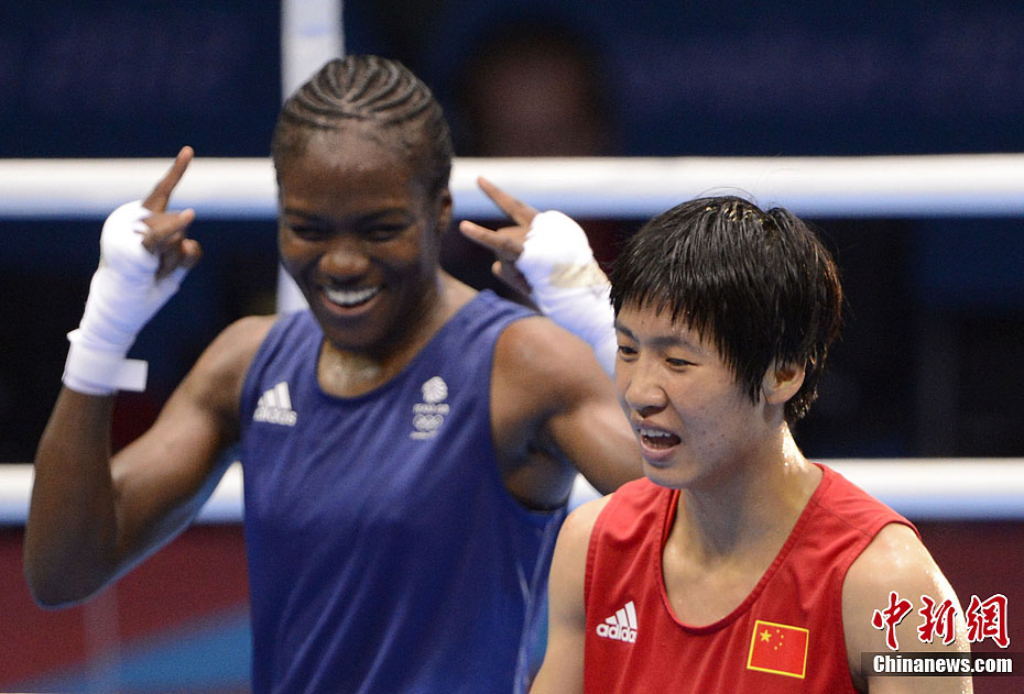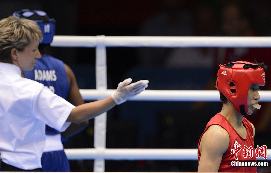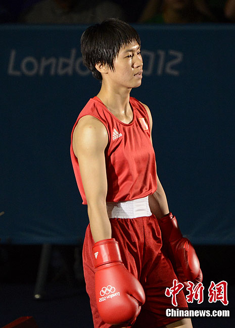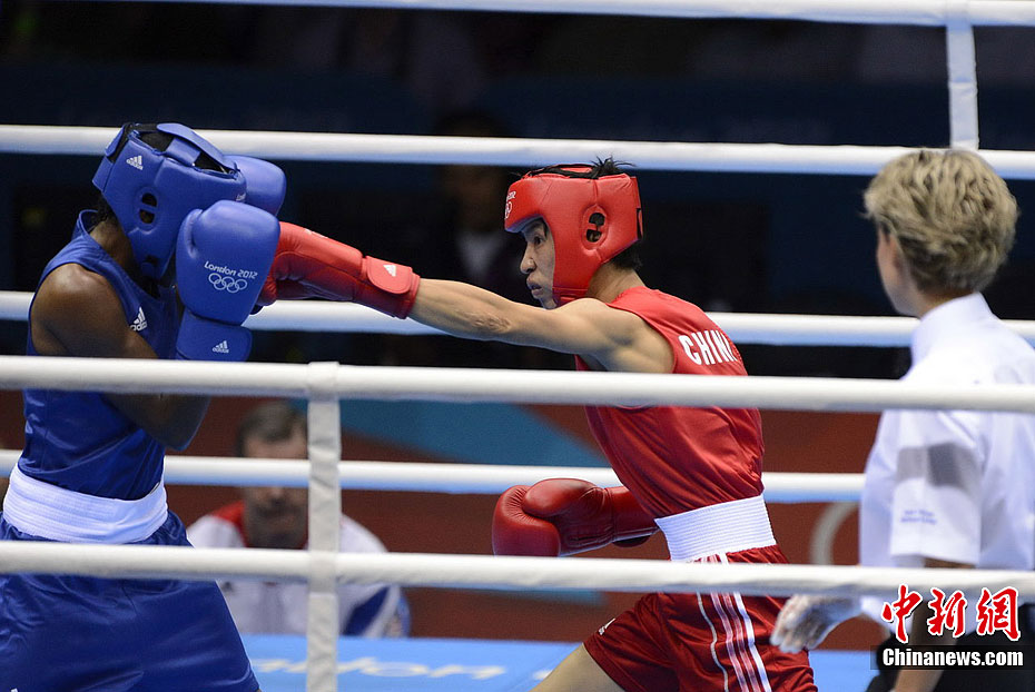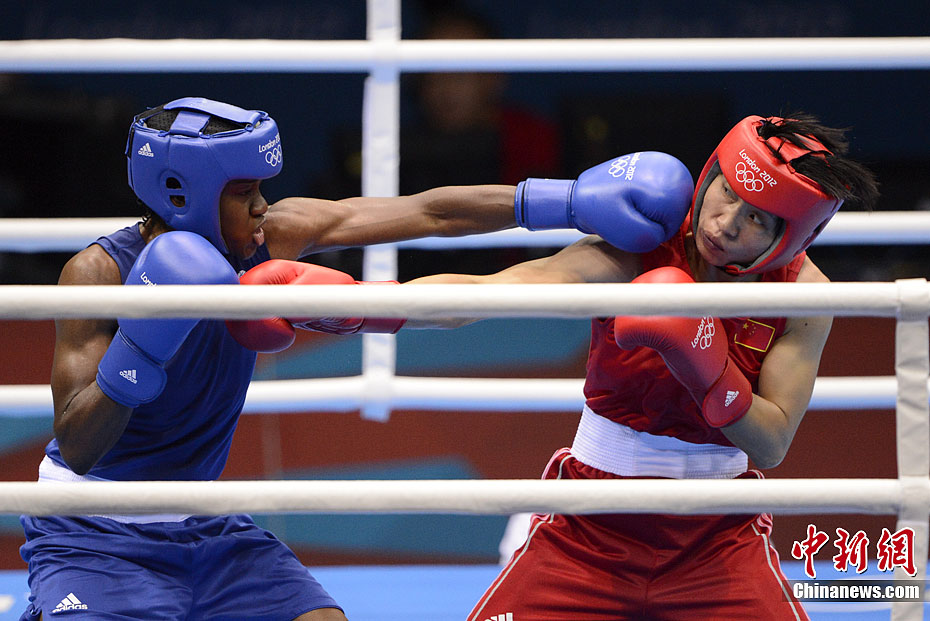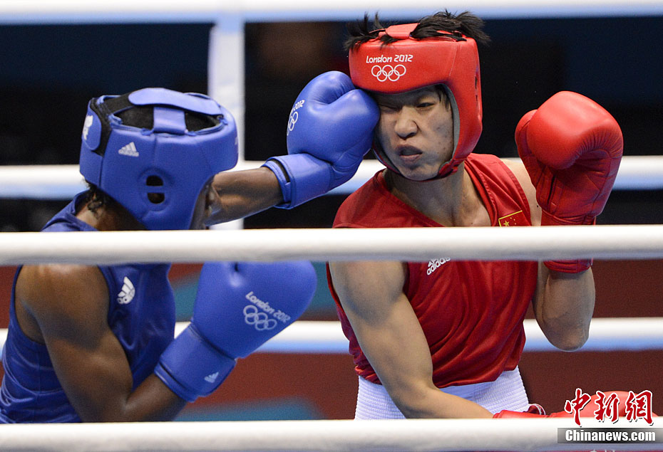 当地时间8月9日,2012年伦敦奥运会女子拳击51公斤级决赛,中国选手任灿灿不敌英国选手尼古拉·亚当斯,获得一枚银牌。图为中国选手任灿灿(红)在比赛中。记者 廖攀 摄