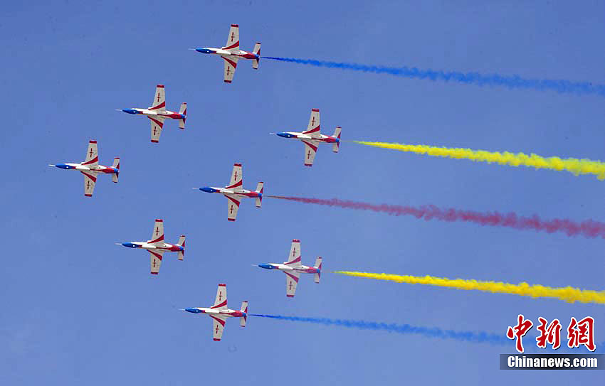 8月26日,空军航空大学开学典礼暨吉林长春第二届航空节在长春大房身机场拉开帷幕。空军航空大学“天之翼”、“红鹰”和空军八一飞行表演队同场献技。图为“红鹰”飞行表演队表演八机菱形队盘旋通场。张瑶 摄