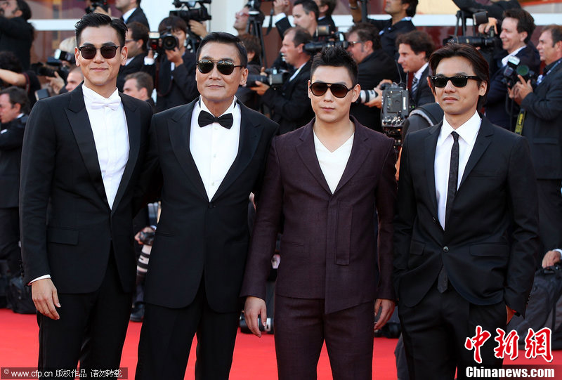 当地时间8月29日,第69届威尼斯电影节开幕。彭于晏、梁家辉、袁晓超、冯德伦化身黑衣党集体黑超遮面比帅,气派非凡登场。图片来源:CFP视觉中国