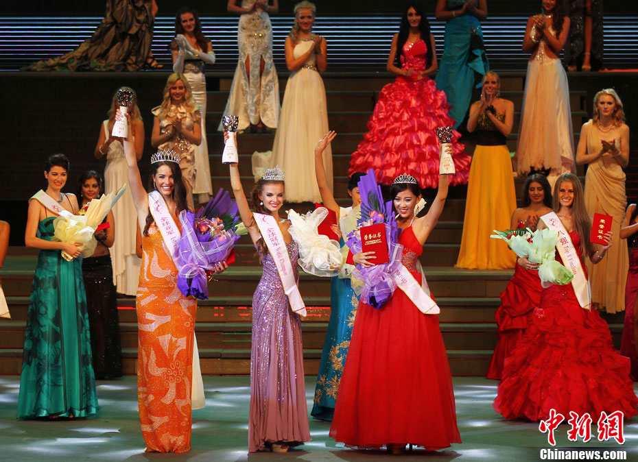 9月9日晚,2012中国历史文化名城博览会闭幕式暨2012全球生态旅游小姐大赛世界总决赛在南京举行,来自世界五大洲的四十多位佳丽经过国服、泳装、礼服展示,最终来自白俄罗斯的达妮娅、塞尔维亚赛妮娅和中国北京的李肖瑶分获冠亚季军。中新社发 泱波 摄