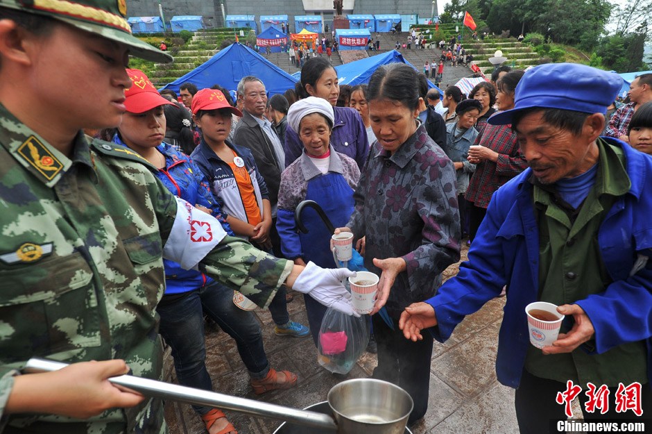 9月13日,彝良震区震后医疗卫生工作有序开展,云南公安边防总队给予民众最大力度的医疗支持。图为官兵在安置点熬预防感冒的中药,向民众免费发放。中新社发 任东 摄