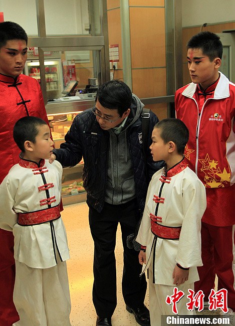 2月7日,北京,央视蛇年春晚进行最后一次彩排,中央电视台演播厅后台,众演职人员紧张忙碌。央视播音员阿丘与小演员沟通。中新社发 国刚 摄