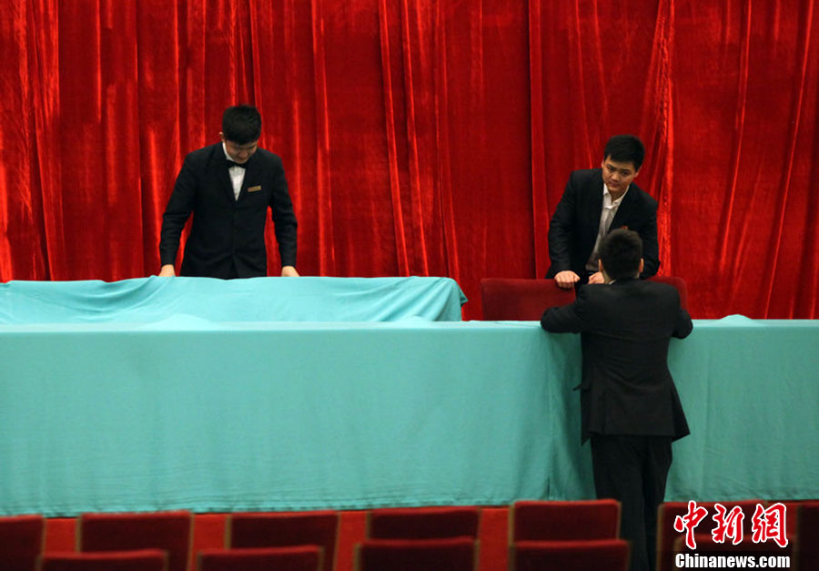 3月1日,北京,人民大会堂内,工作人员在布置会场。田贺 摄 图片来源:CFP视觉中国 版权作品 请勿转载