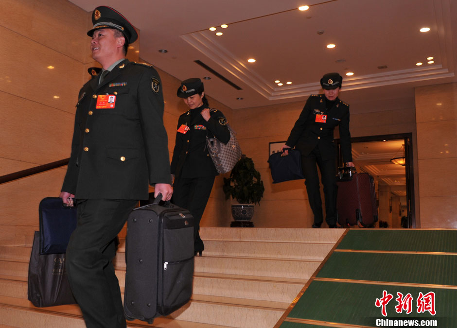 3月2日,参加十二届全国人大一次会议的解放军代表在北京京西宾馆驻地自助报到。中新社发 贾国荣 摄